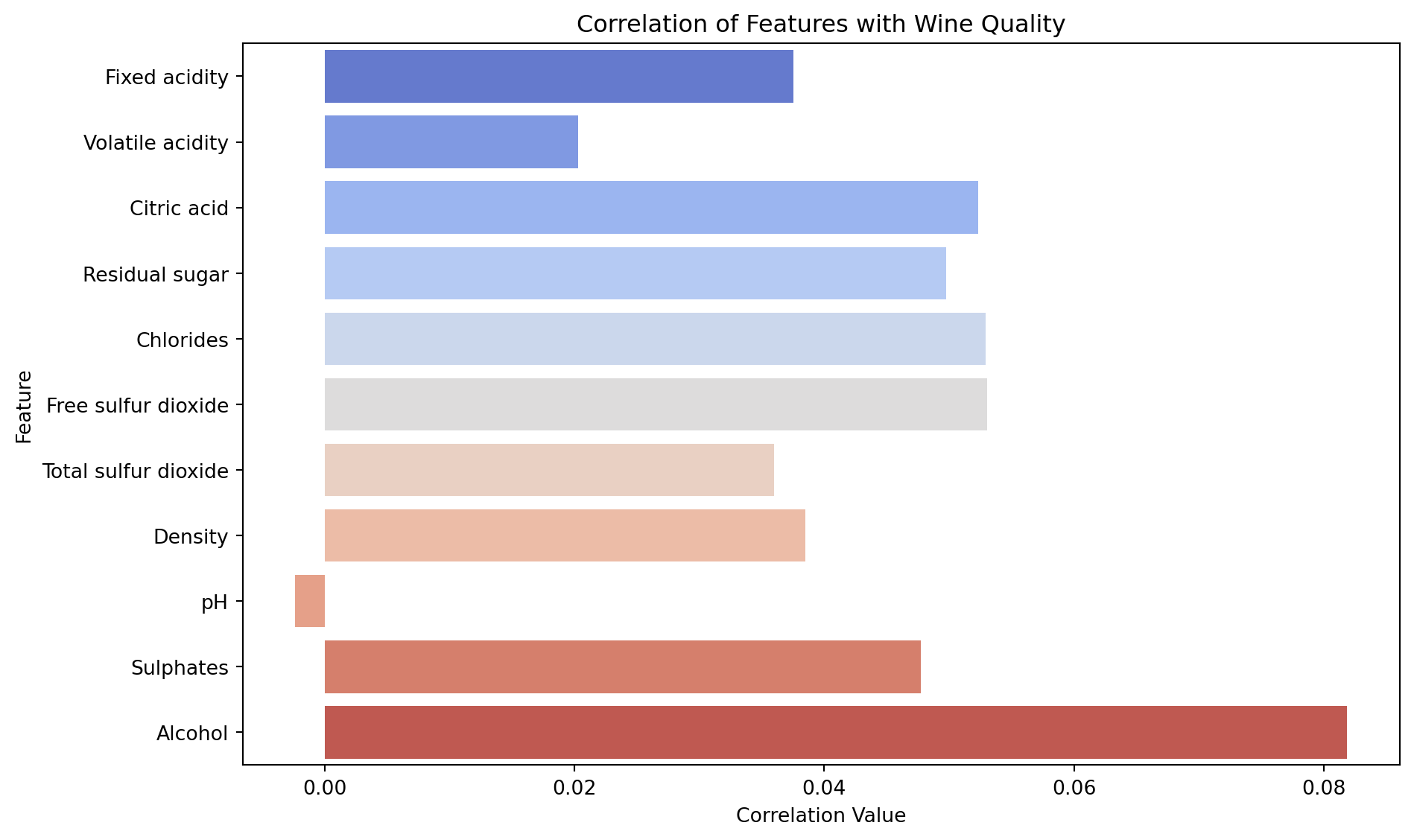 Here is the list of features I used, complete with their correlation to the target variable, Wine Quality: